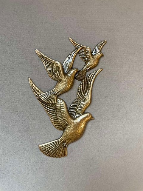 A képen egy aranyszínű, domború fém díszítés látható, amely galambokat ábrázol.